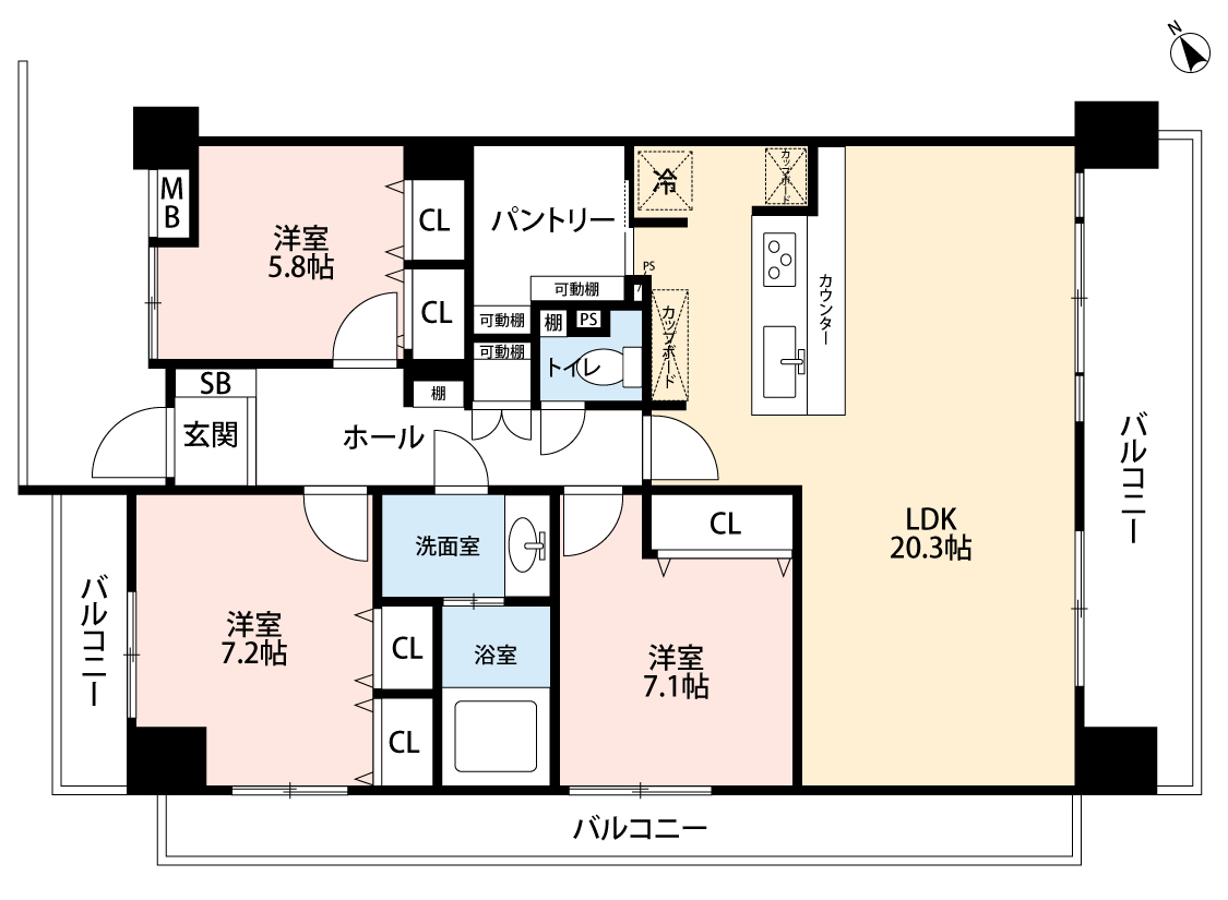 LDK約20.3帖 洋室約7.2帖 洋室約7.1帖 洋室5.8帖 パントリー